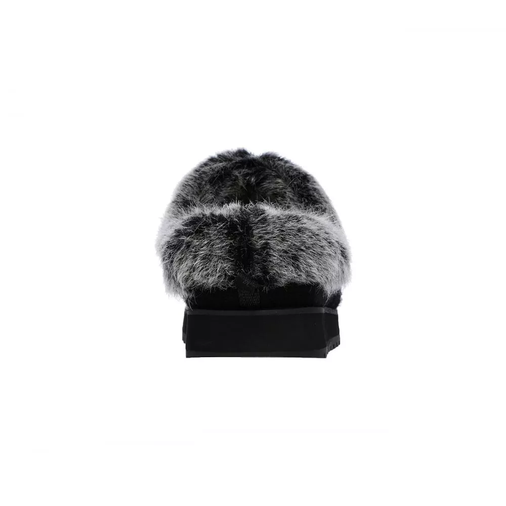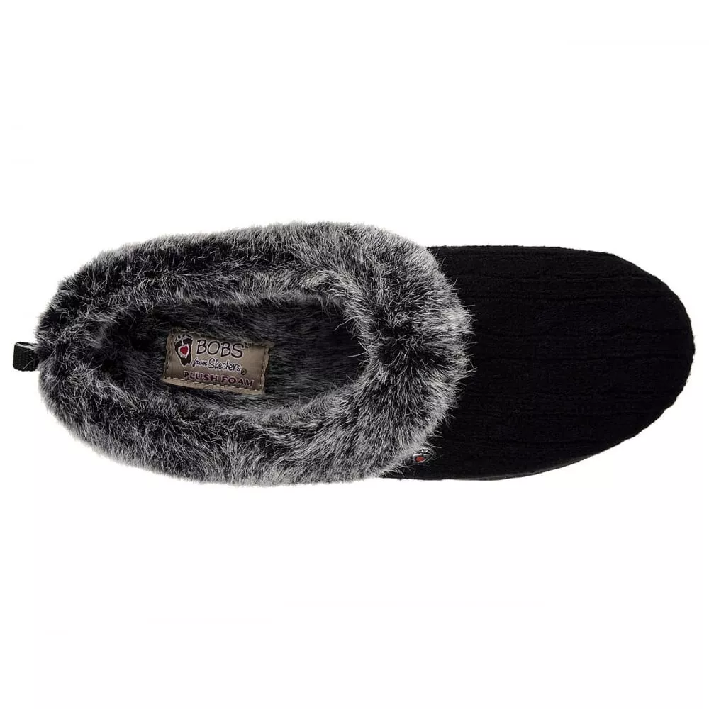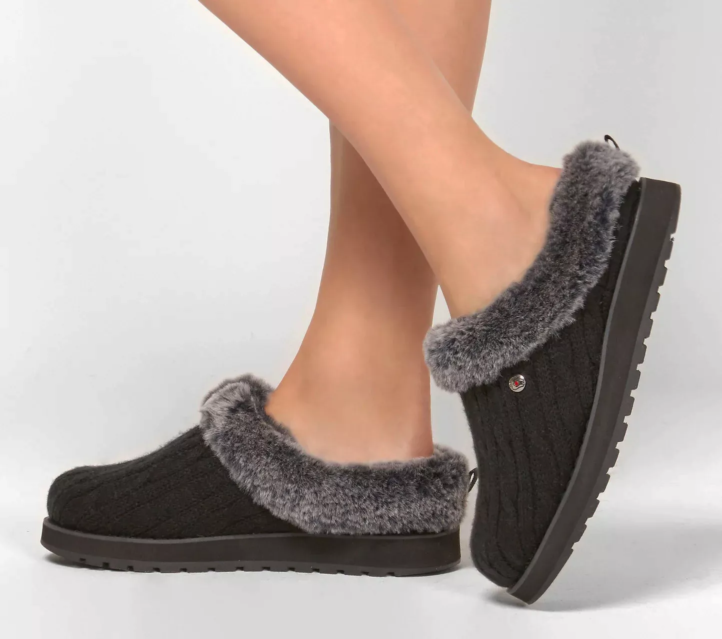 Stay cosy and comfortable in classic style with the SKECHERS Bobs Keepsakes – Ice Storm shoe. Soft sweater knit fabric upper in a slip on casual comfort clog slipper with faux fur lining and Plush Foam footbed.